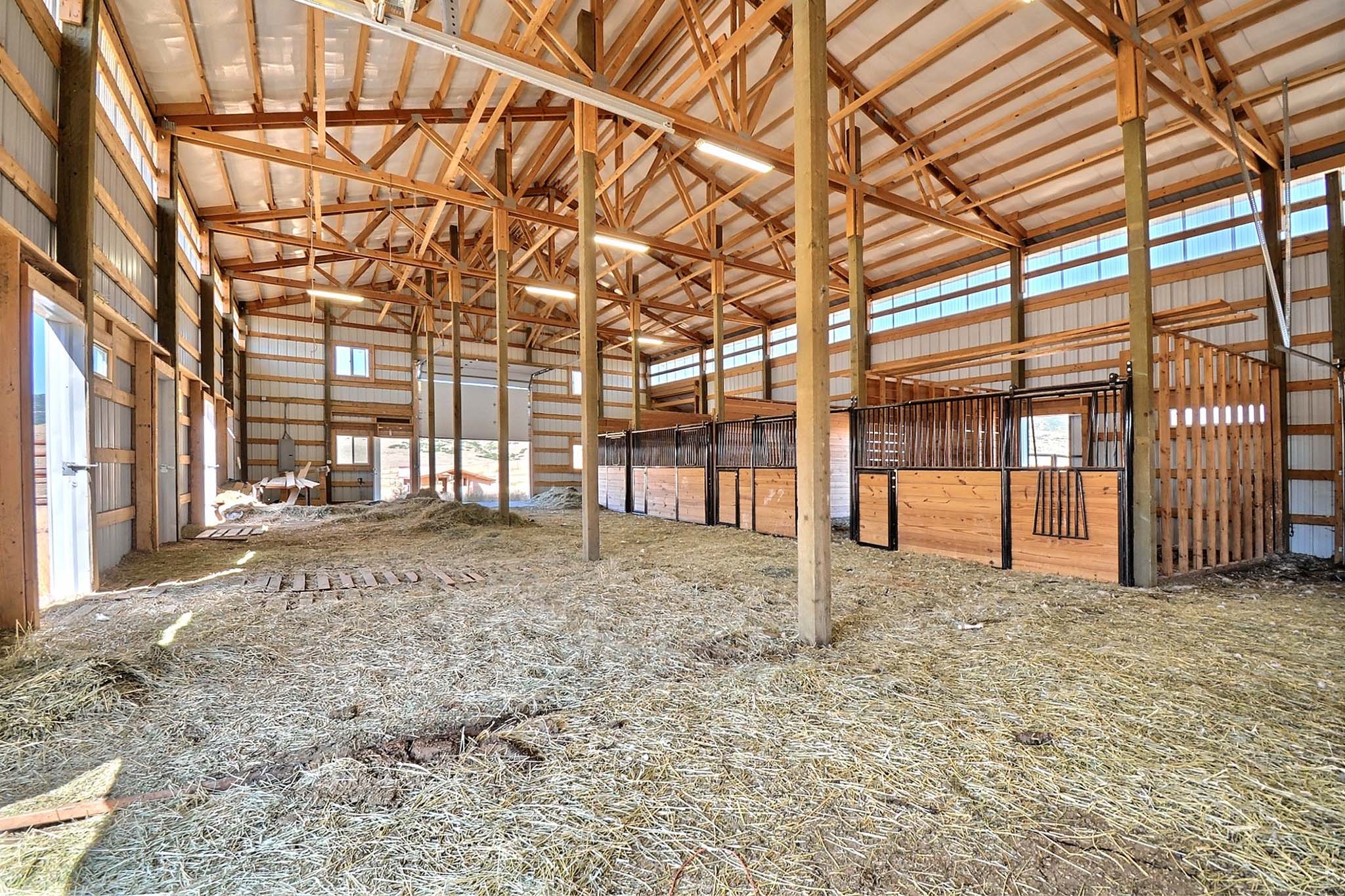 - Large Horse Barn, concrete floors, foaling room, and separate stables with outdoor pens